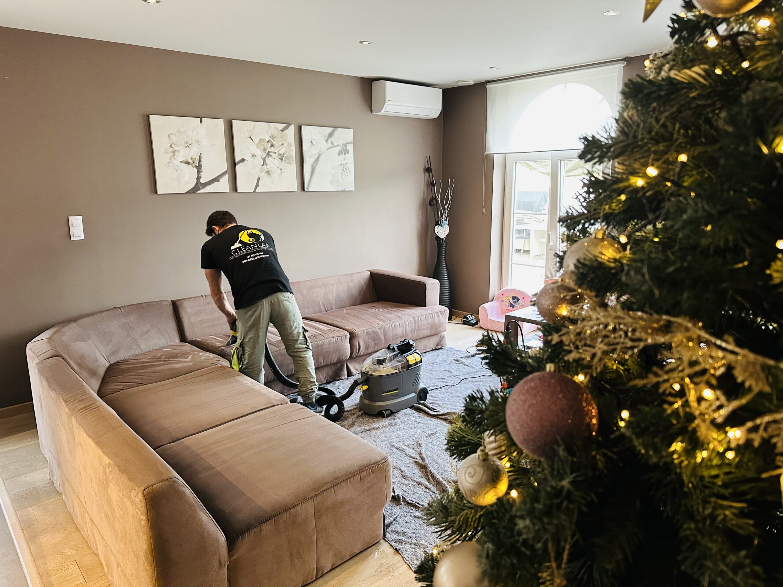 Het enige moment dat we vragen om afstand: Tijdens de reiniging zelf. Niet omdat de producten gevaarlijk zijn, maar omdat onze machines zwaar zijn (20+ kilo), er slangen over de vloer liggen, en de bank nat is. Gewoon om ongelukken te voorkomen.